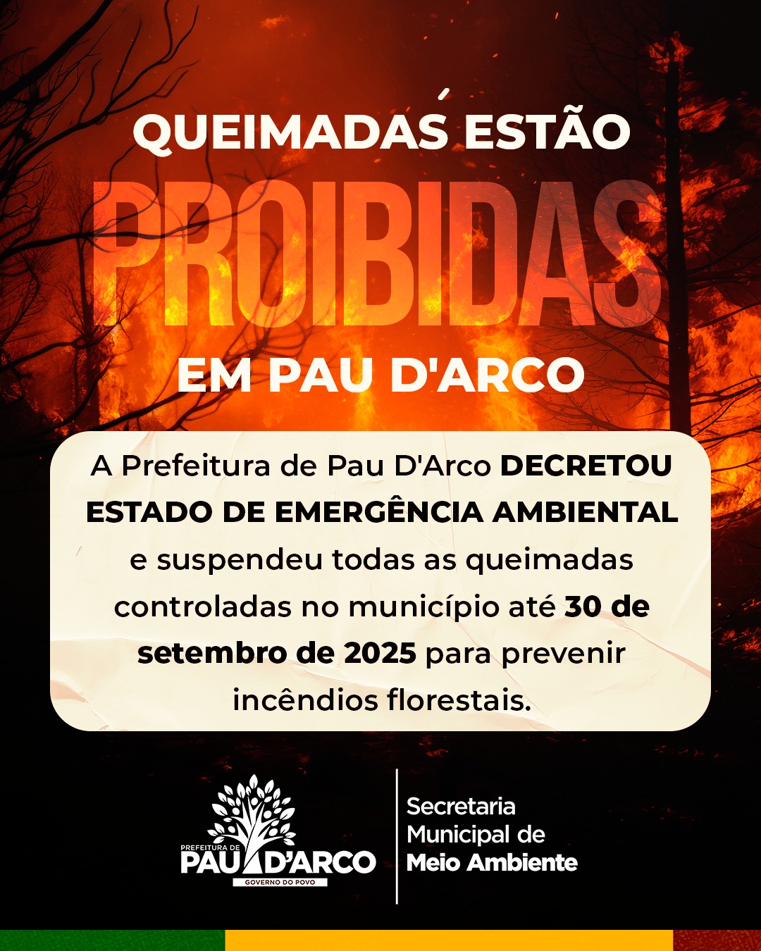 Fica PROIBIDA toda e qualquer prática de queimada, inclusive as queimas controladas que tinham autorização prévia. A medida é uma ação preventiva essencial para proteger nosso município durante o período de seca, quando o risco de incêndios florestais aumenta muito.